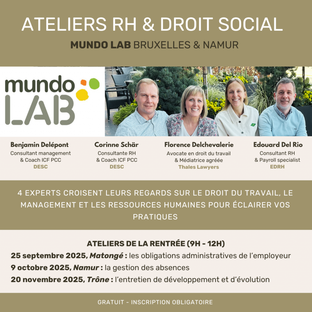 Dès l’automne 2025, Me Florence Delchevalerie lancera le 1. cycle d’ateliers RH & droit social dans les locaux de Mundo Lab à Bruxelles et Namur.